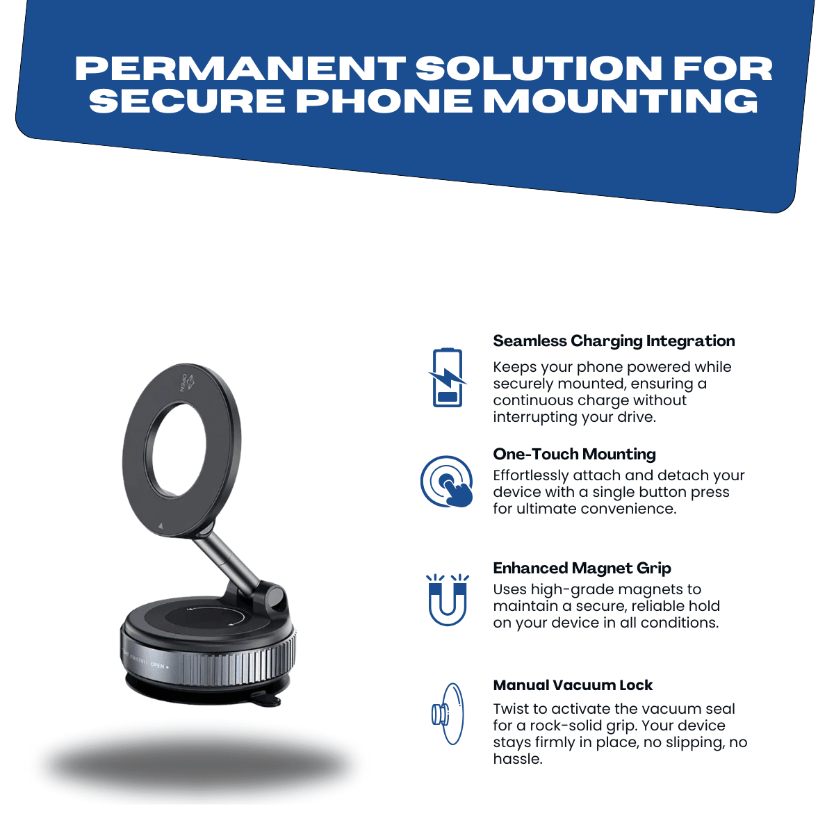 Transform every journey and workspace with the Nixevo™ MagVac 360 Dual Lock Holder. From safer driving to hands-free cooking or workouts, this isn’t just a mount — it’s an everyday essential that blends efficiency with style. With 360° freedom, dual lock security, and a sleek compact build, the Nixevo™ MagVac 360 redefines what a phone holder can do — keeping you connected, protected, and in control.